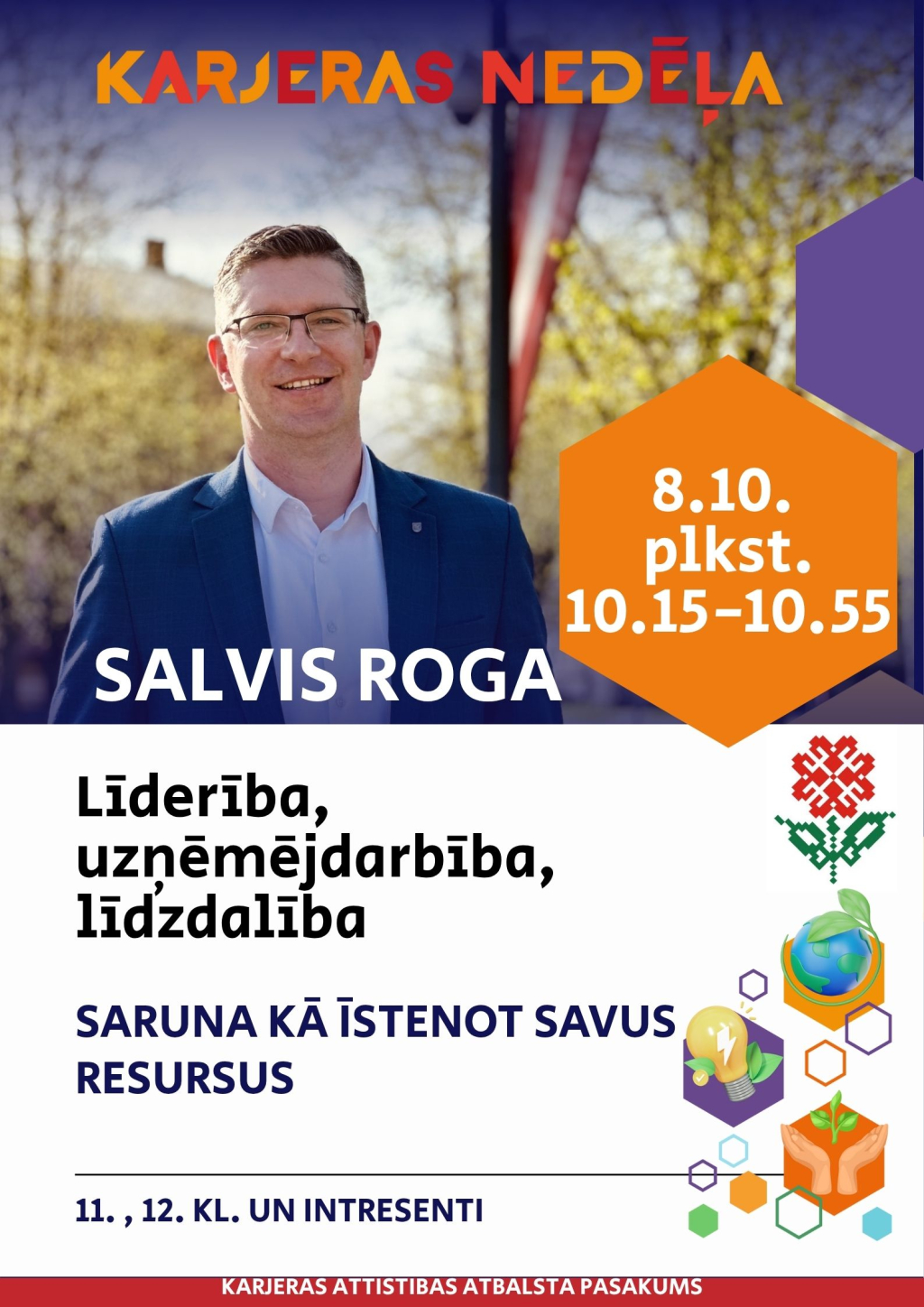 "Jāgrib!" tā par līderību, līdzdalību un uzņēmējdarbību saka Salvis Roga. 8.10. S. Roga viesojās pie 11. un 12. klašu skolēniem, lai dalītos savā pieredzē par karjeras veidošanu. Līderība, līdzdalība un uzņēmējdarbība - tās loma mūsu ikdienā un kā katram pašam atrast savu ceļu. Vairāk lasi rakstā.